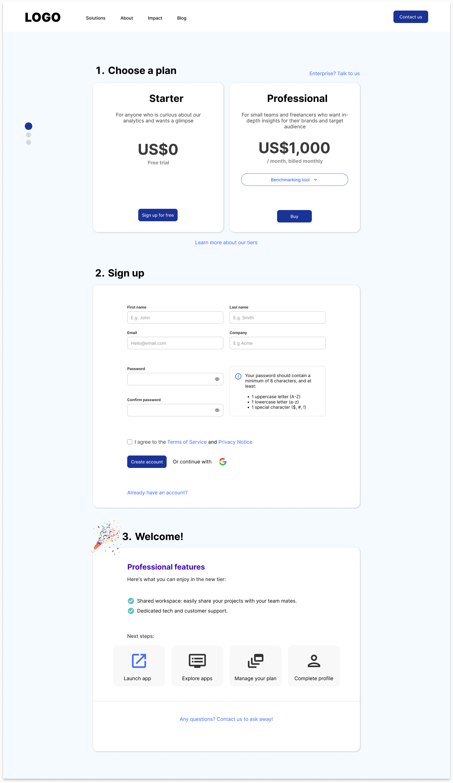Whether the user clicks on Sign up or pricing plans, they go to the first step, which lets the user choose which plan they want to sign up under.
