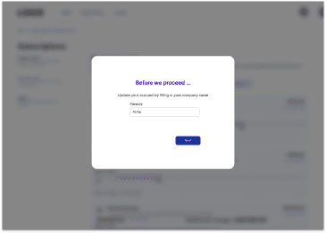 Because the user did not sign up as a professional user (and was not given the choice to), there is a popup to ask the user for their company’s name.