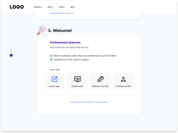 The final step congratulates the user on finishing the sign up, shows the features they are entitled to and the next steps they can take.